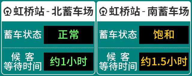 一级情报板设在虹桥枢纽周边作为“第一站指引官”,提前告知蓄车场状态和候客等待时间,进场早选择。