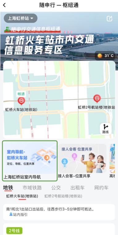 入口二:“随申行”平台(APP、微信小程序)首页入口,或点击“枢纽通”进入上海虹桥站,点击室内导航启动服务