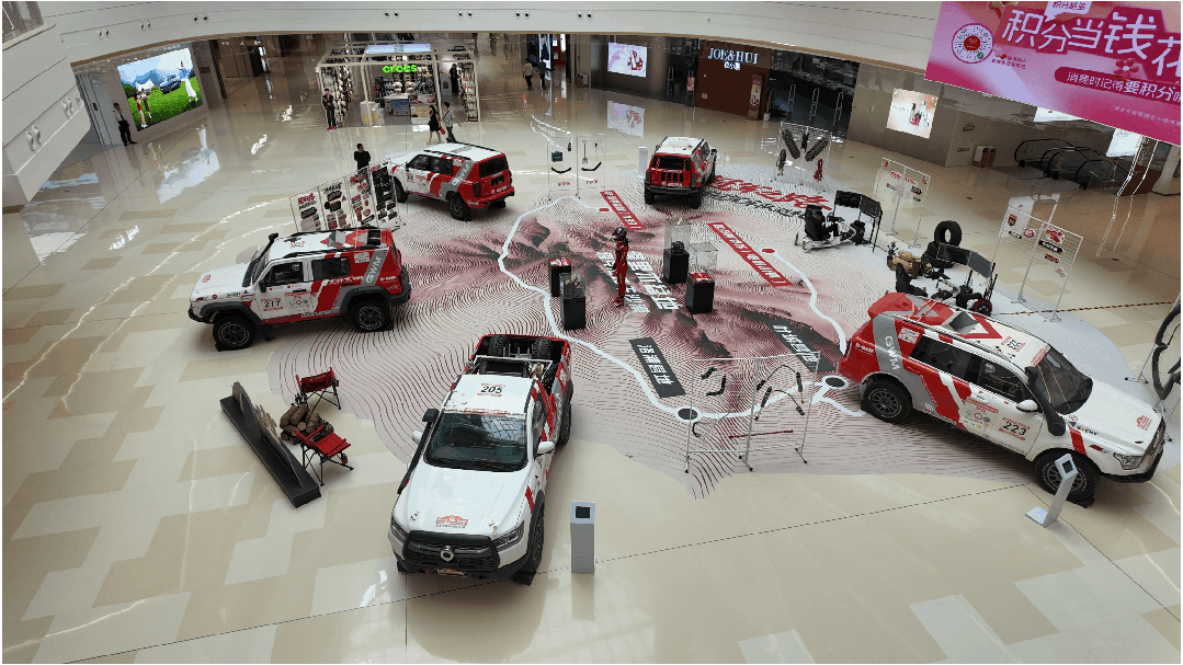 今年夏天,长城汽车环塔冠军车队亮相商场,活动现场不仅还原了赛事中的重要地标,通过展览传递越野文化与赛事精神,还专门搭建了仿真模拟赛道,让消费者可以亲身体验驾驶乐趣。