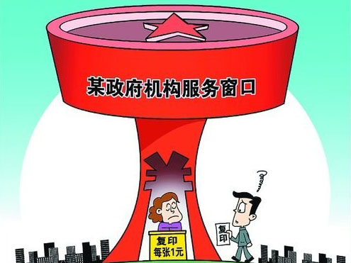 人们对政府机构办事窗口的高价复印非常反感,既有对涉嫌、趁火打劫的窝火,更有对窗口单位服务不到位的无奈。办事者事先不清楚哪些证件材料需要复印,复印几份。而办事之前想要查询,往往并不容易。所以临时的、紧急的复印,总是难以避免。这不仅降低了办事效率,浪费了不必用的时间,而且为商家借权营生提供了可乘之机。[详细]