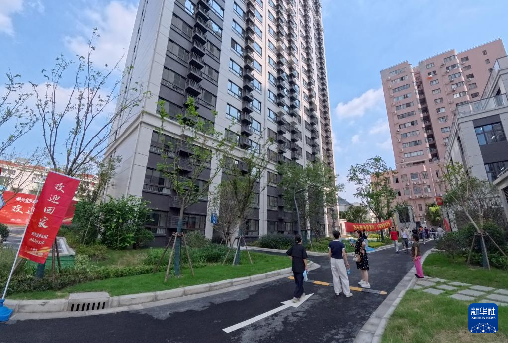 9月15日,谈家桥小区的老邻居们走在新家小区内。