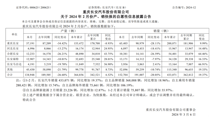 长安汽车公布的2月销量数据显示,1-2月其零售销量为493989辆,同比增长42.5%,批发销量为433071辆,同比增长19.4%。其中,自主品牌新能源车型零售销量为89374辆,同比大增119.1%,海外零售75661辆,同比增长106.2%。细分品牌销量中,长安启源、深蓝汽车和阿维塔表现亮眼,零部件短缺问题已缓解,实现了大批量交付。