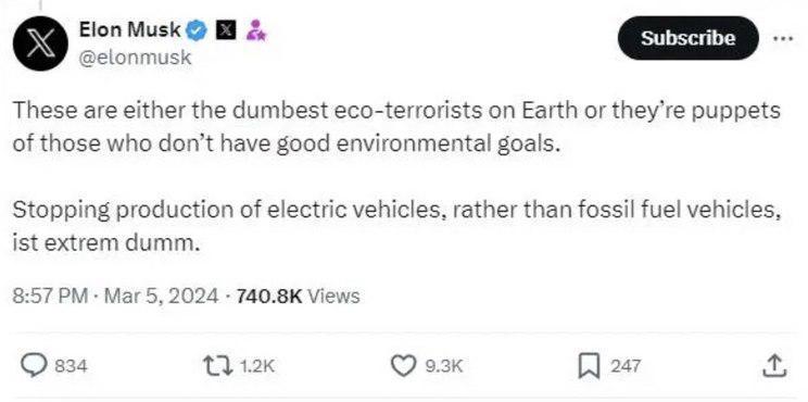 特斯拉德国柏林超级工厂因疑似环保人士纵火高压输电塔而停电,导致停产,致使当天约千台汽车未完工,预计造成数亿欧元损失。CEO马斯克批评该行为愚蠢,强调电动车而非燃料车应是生产重点。极左组织“火山集团”声称负责,攻击特斯拉消耗地球资源。当地政府指出事件威胁数千人基本电力供应,影响医疗保障。工厂扩建遭当地居民反对,担忧对森林造成破坏。